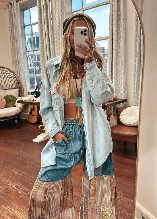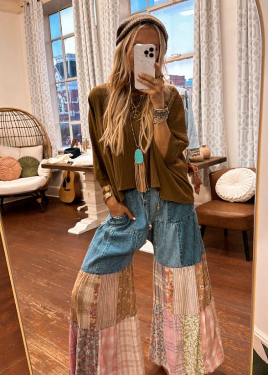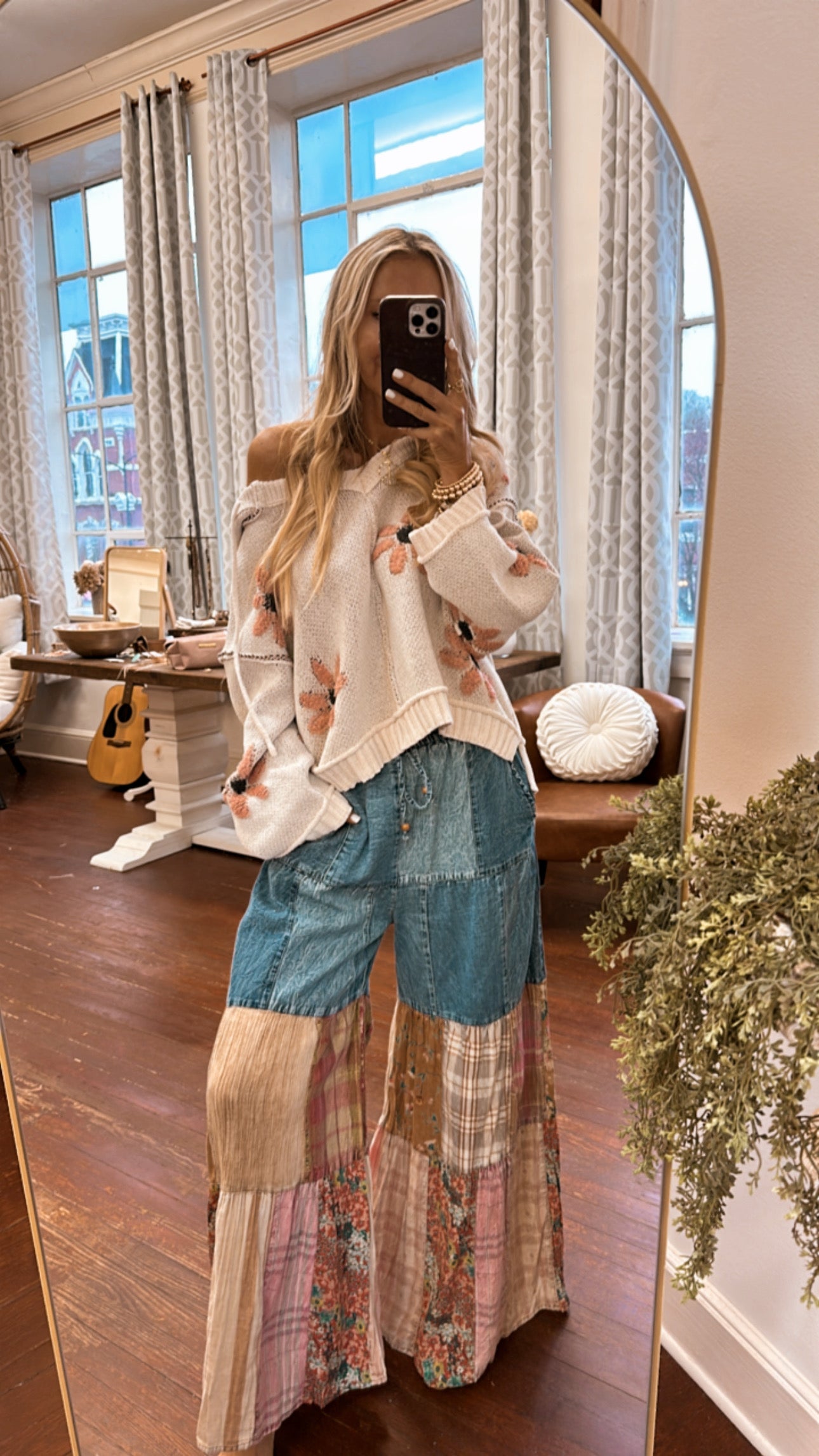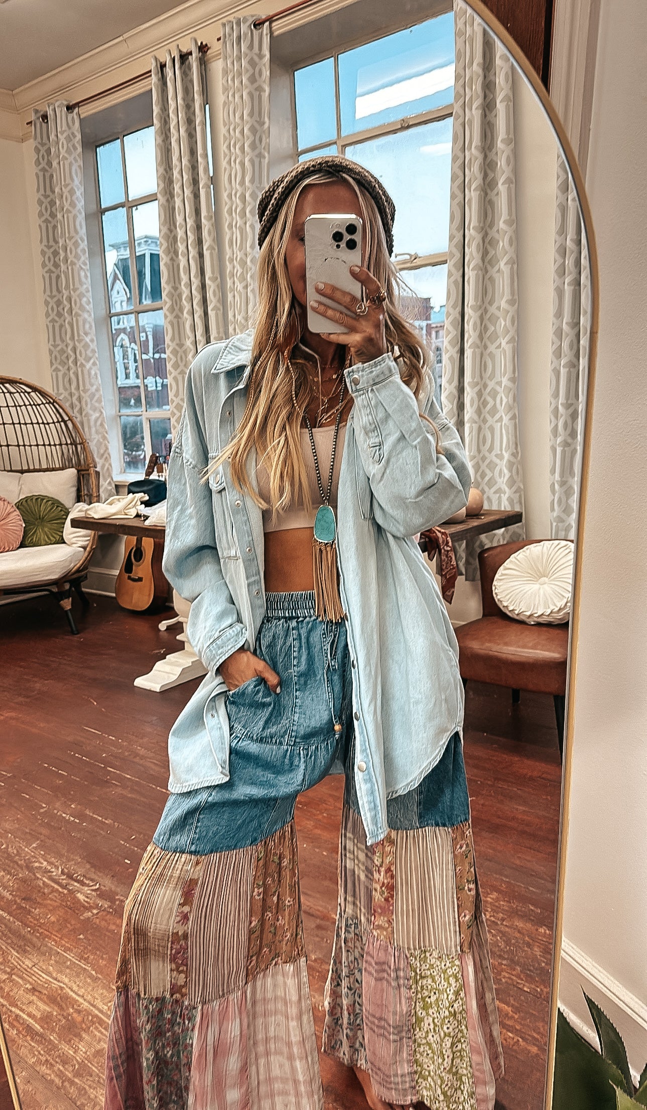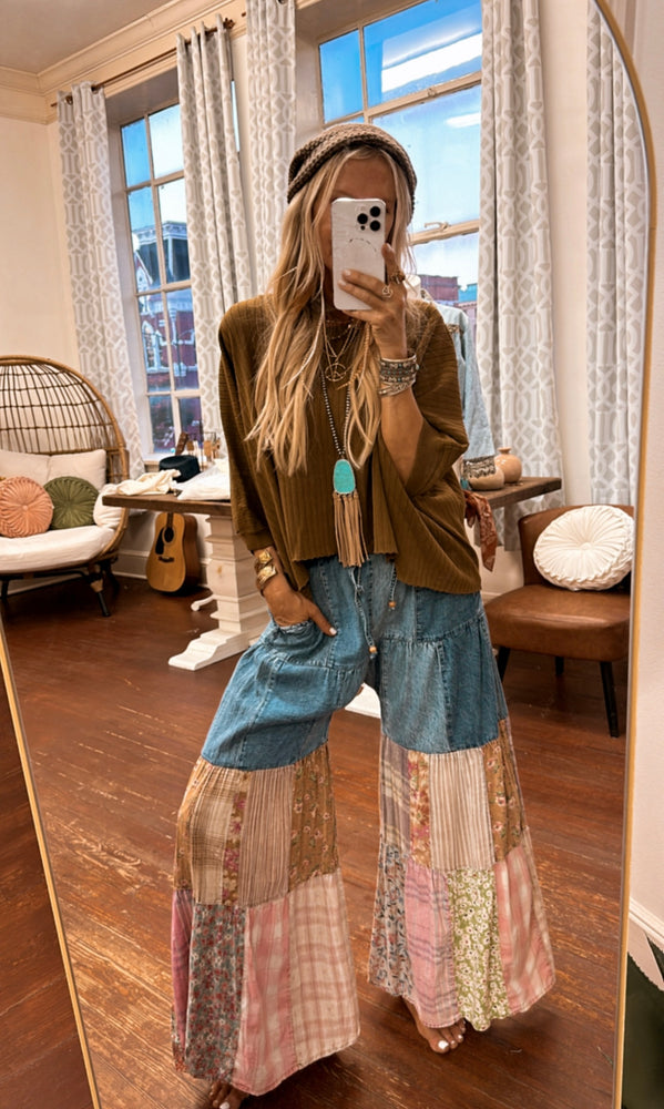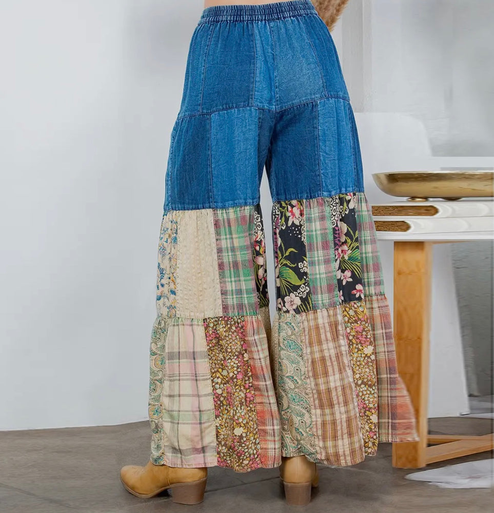 Hippie style with a bohemian touch. These so special pants feature a mix and match of patterns creating a fun, unique look. Super lightweight not a true denim, with adjustable tie belt.