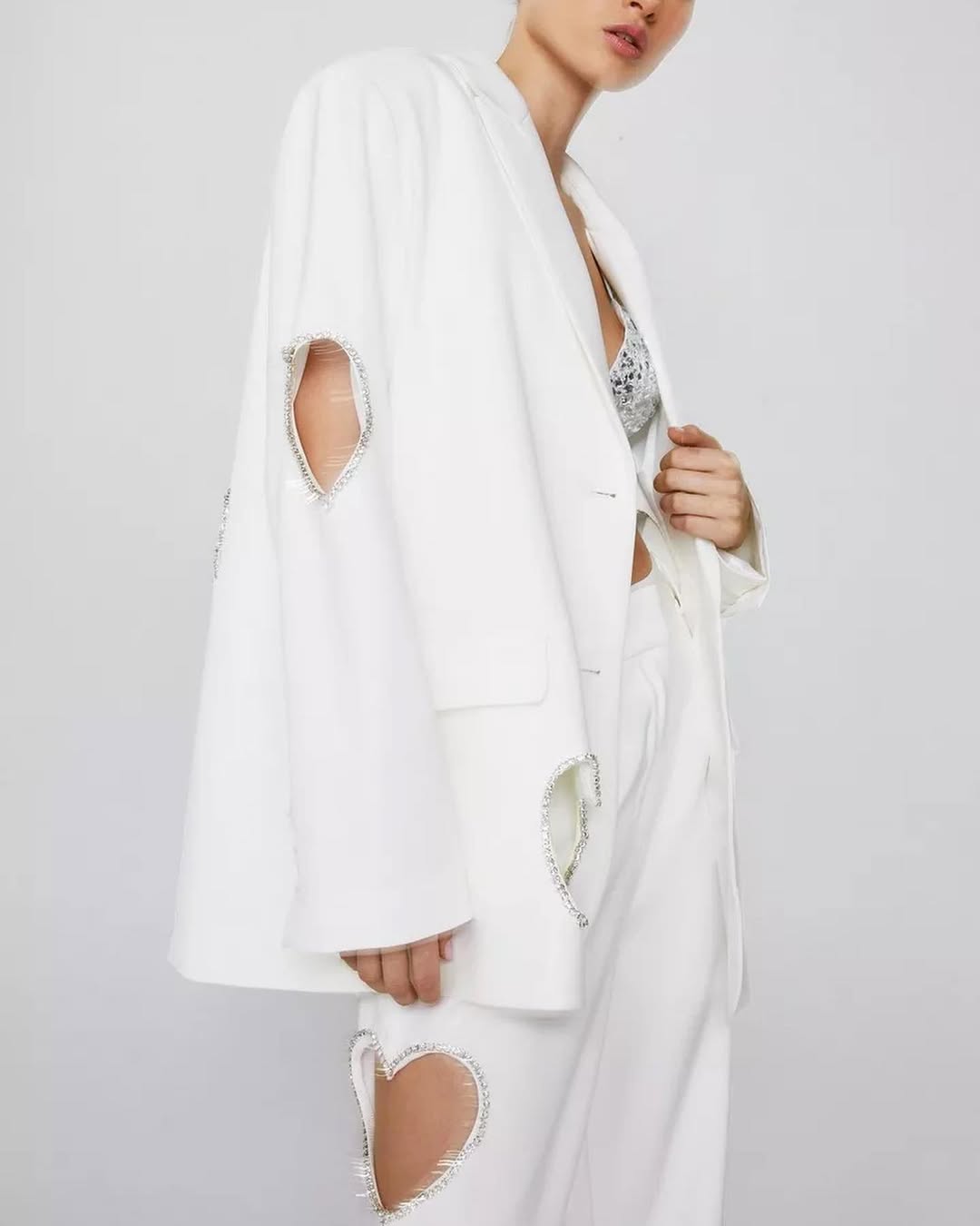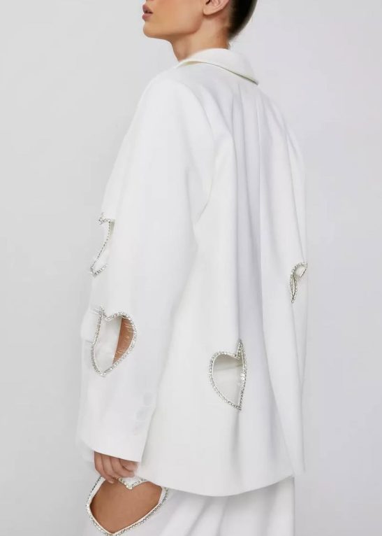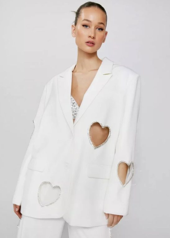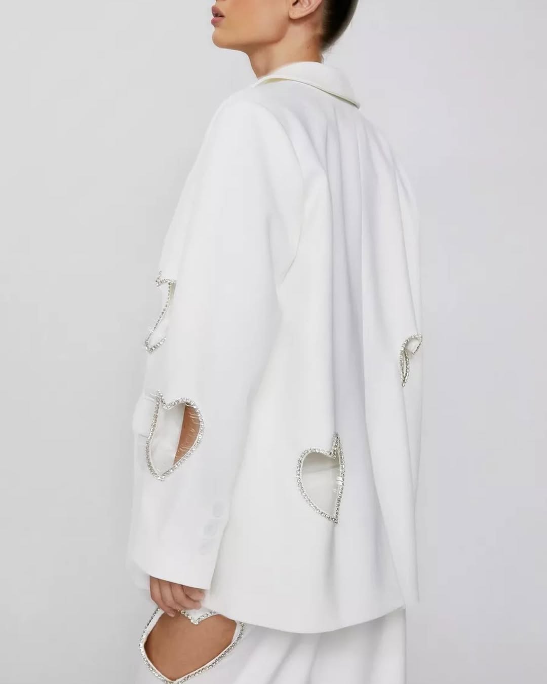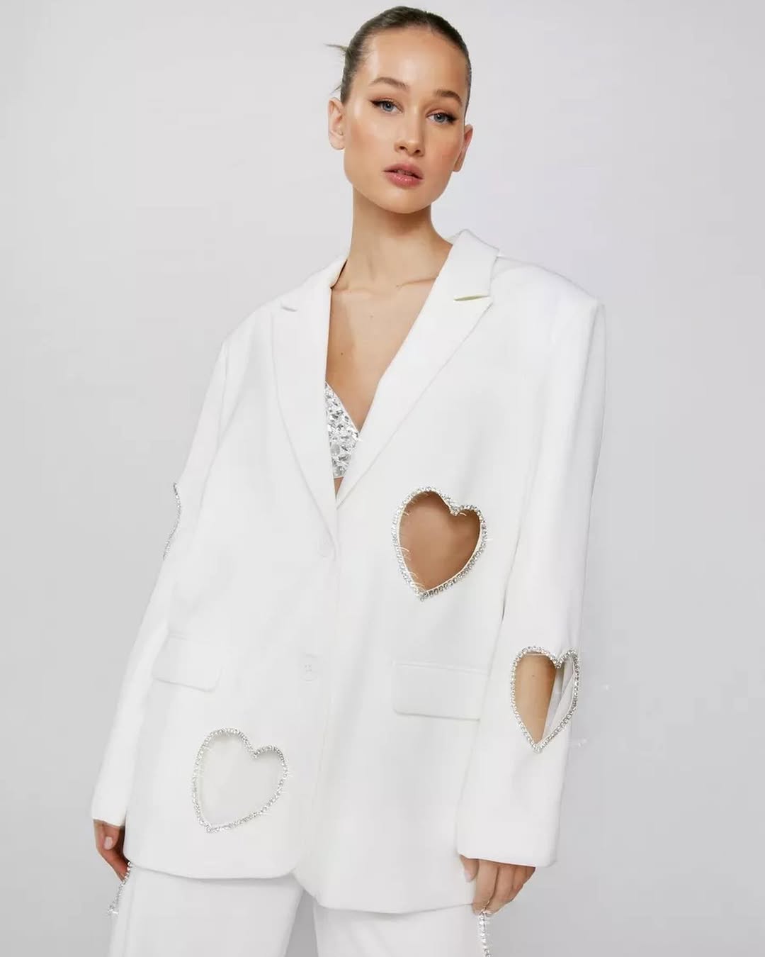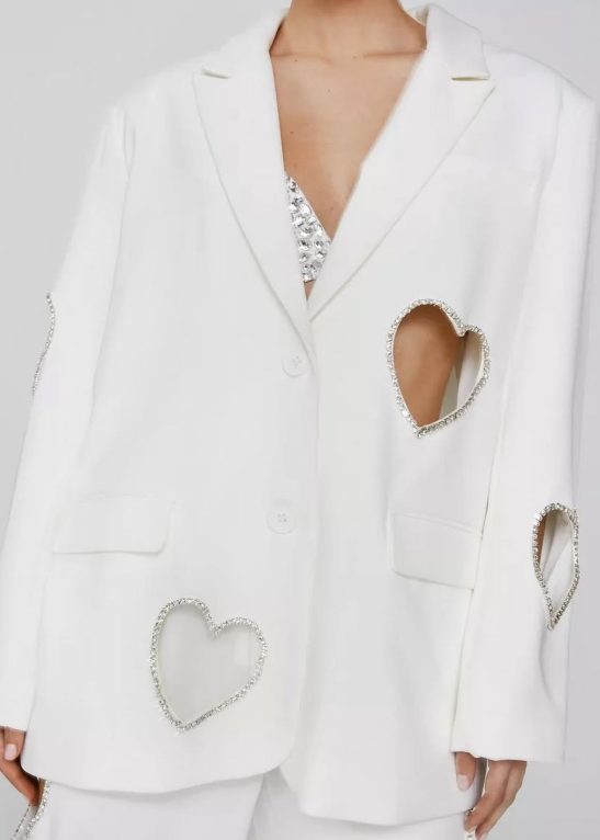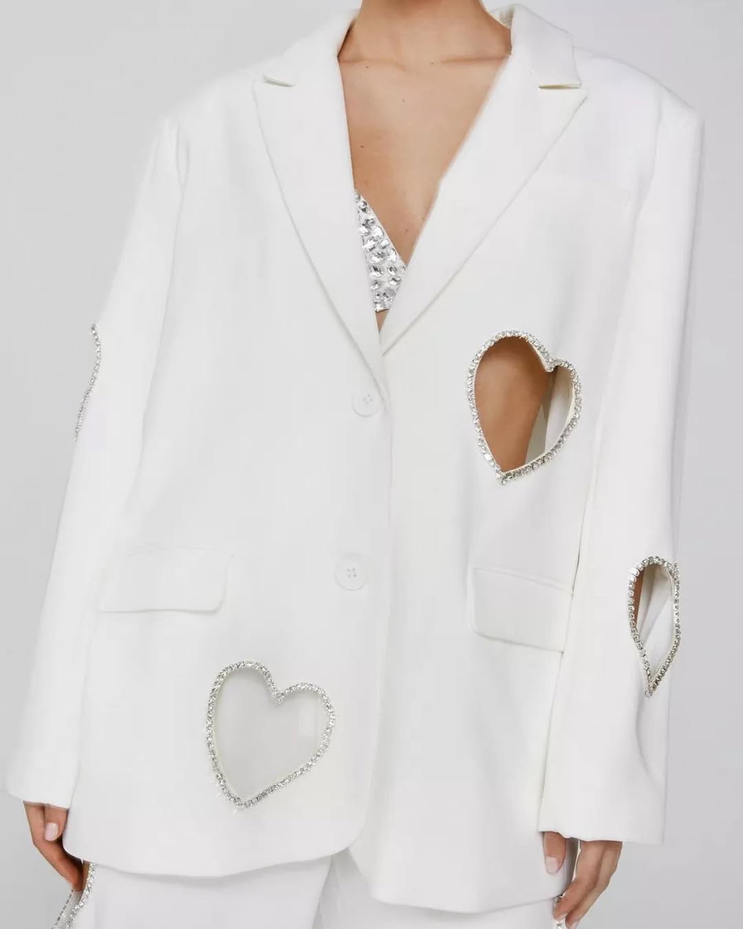 Heart eyes. Feel confident in our blazer, with flirty heart cut outs and sparkling diamante trims, made in high quality satin fabric. Pairs well with the matching pants or mini dress and strappy heels for an occasion look that will take you to all your upcoming parties, from bachelorettes to birthdays to fancy date nights.