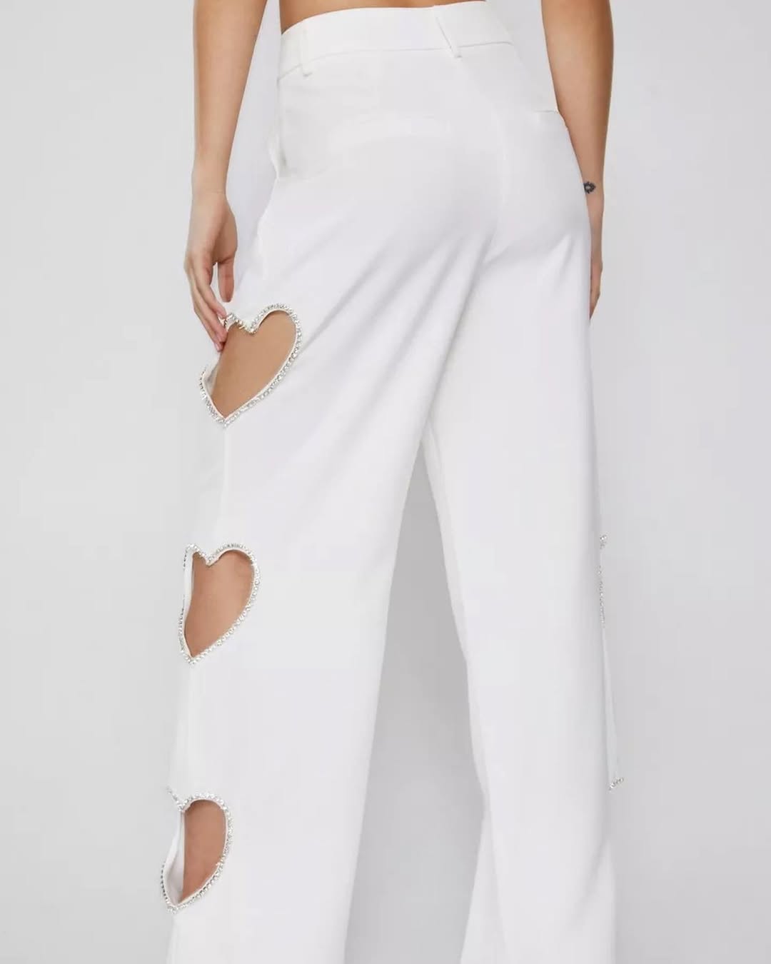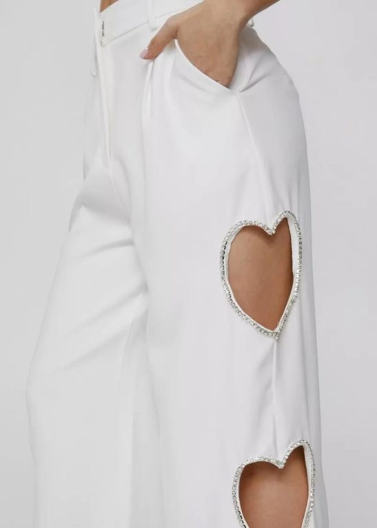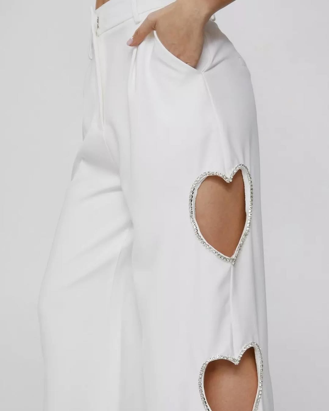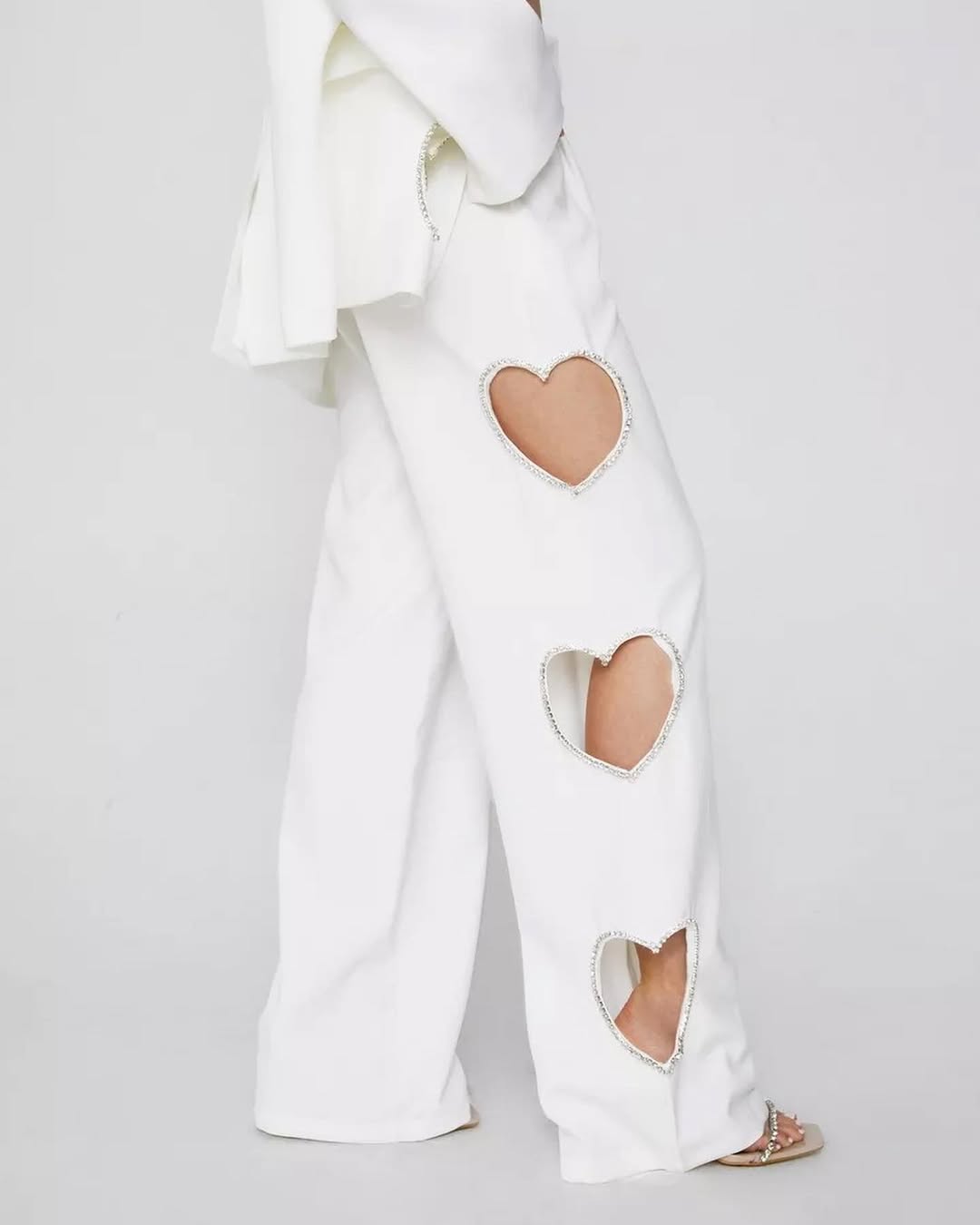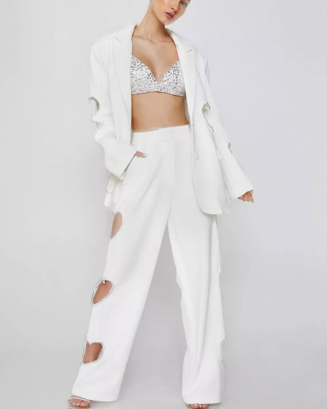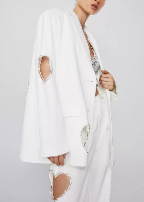 Heart eyes. Feel confident in our blazer, with flirty heart cut outs and sparkling diamante trims, made in high quality satin fabric. Pairs well with the matching pants or mini dress and strappy heels for an occasion look that will take you to all your upcoming parties, from bachelorettes to birthdays to fancy date nights.