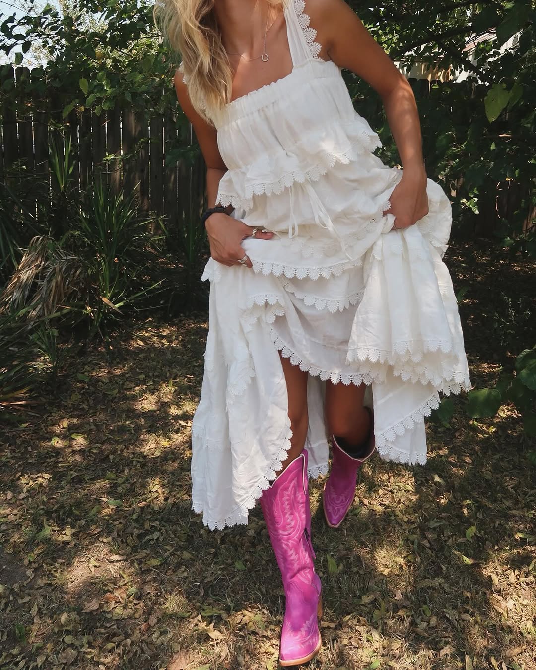 A vision of romance and elegance, the lace cake maxi dress is designed for those who love dreamy, feminine silhouettes. Featuring delicate lace layers and a cascading tiered skirt, this dress brings a touch of fairytale charm to any occasion.