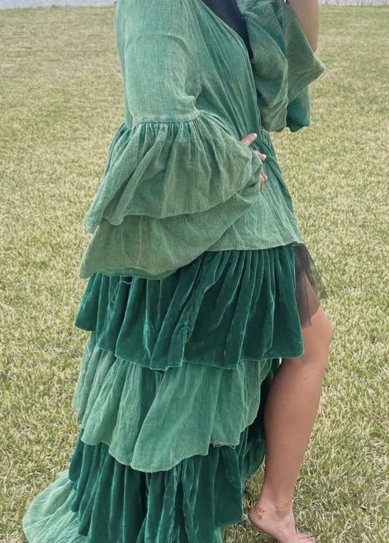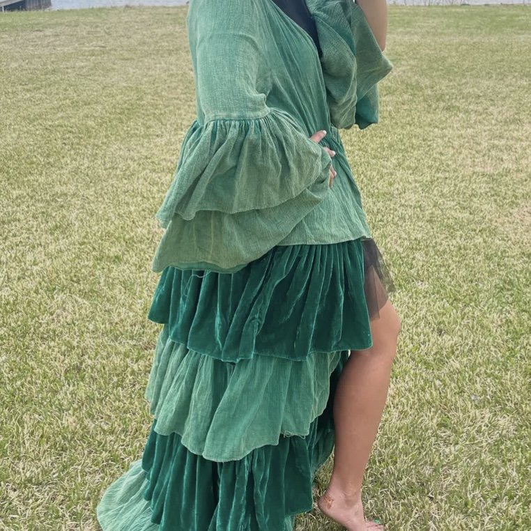 his AMAZING Velvet duster is a show stopper. This gorgeous art piece can be worn by all!! The last ruffle is cotton so if it is too long it can be cut off to make it shorter. One size fits most. Looks great paired with the Enchanted Garden Dress.
