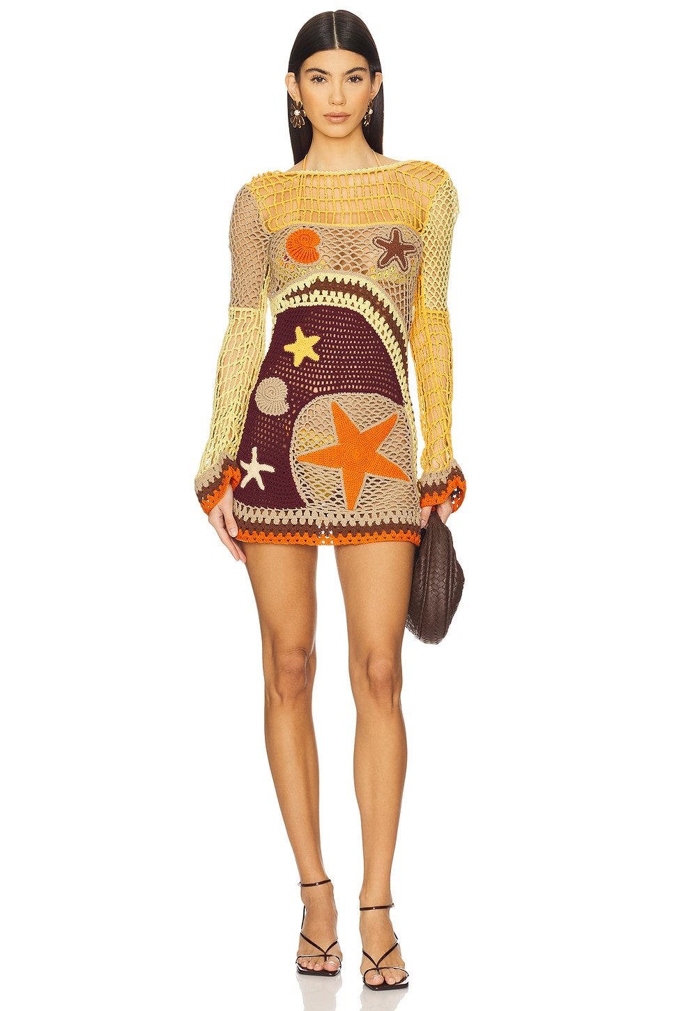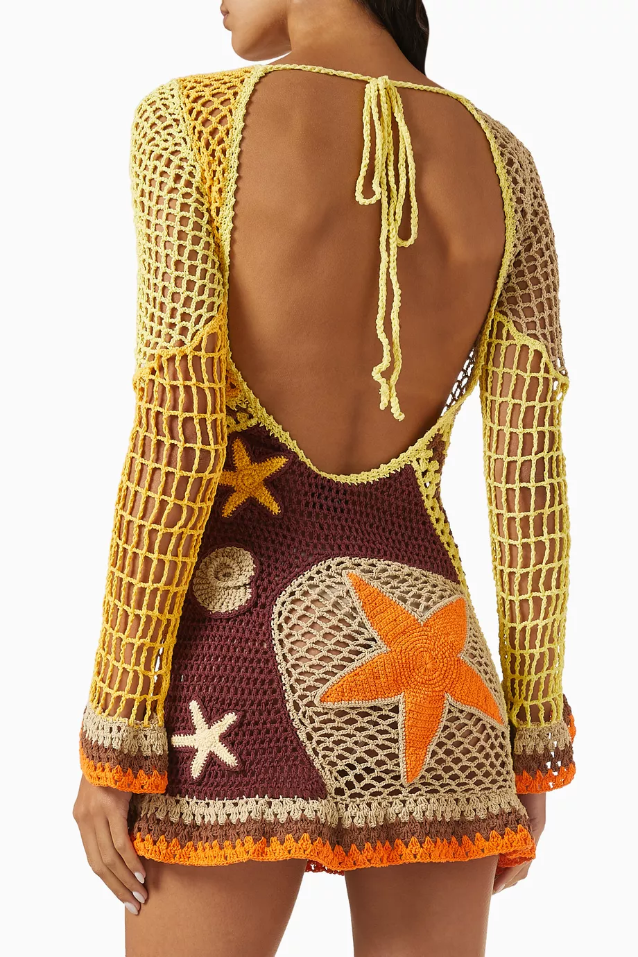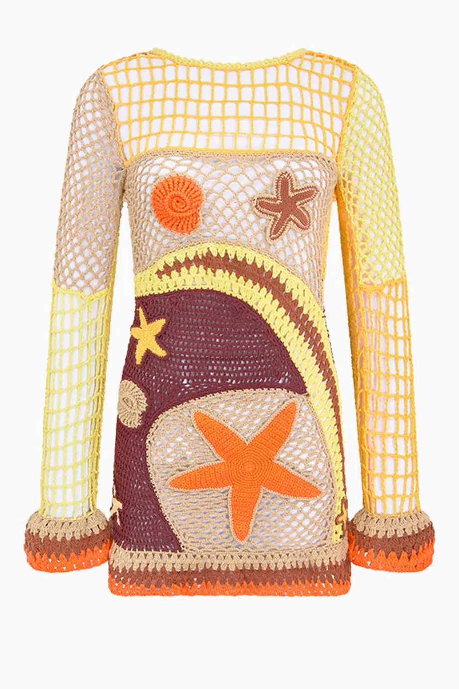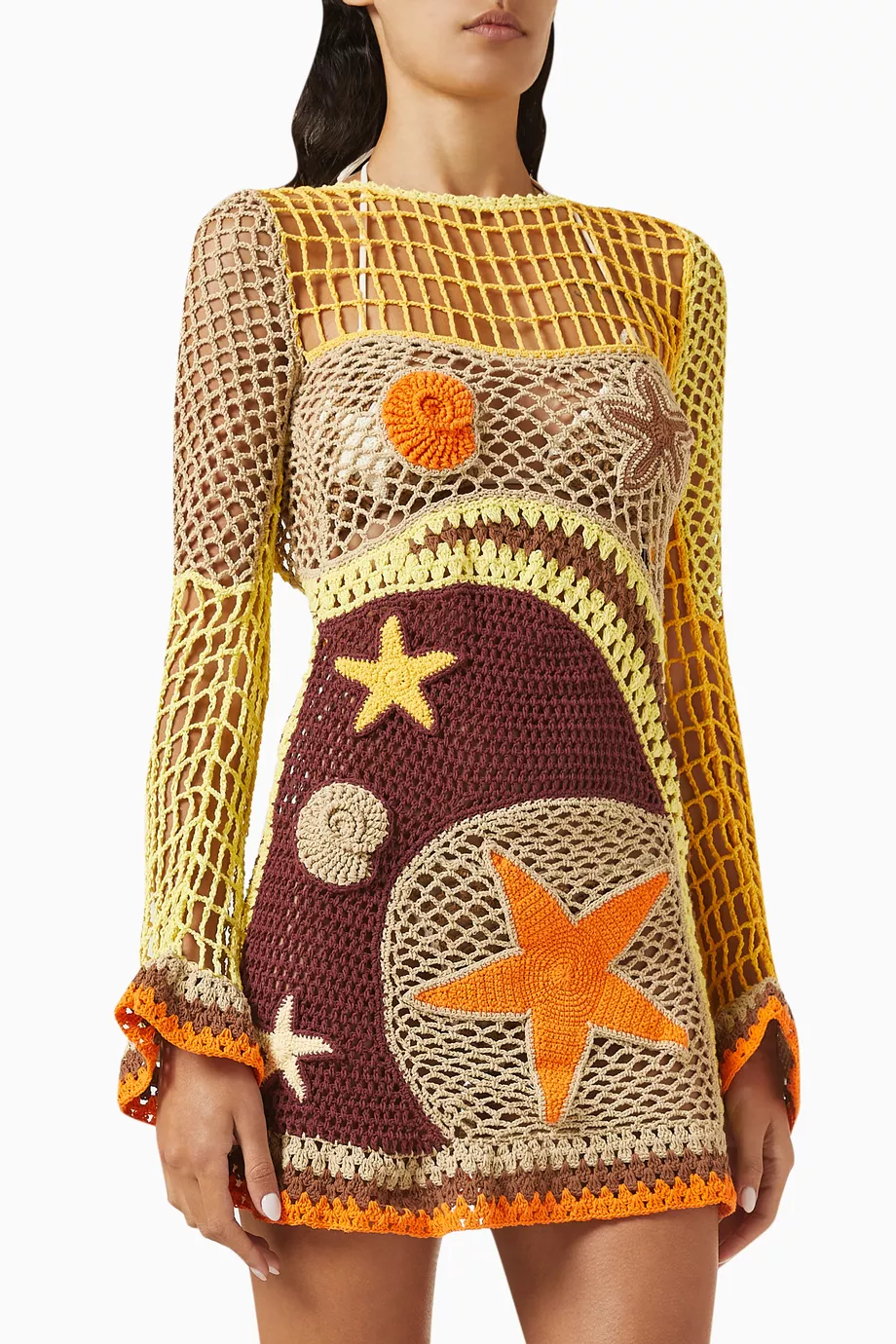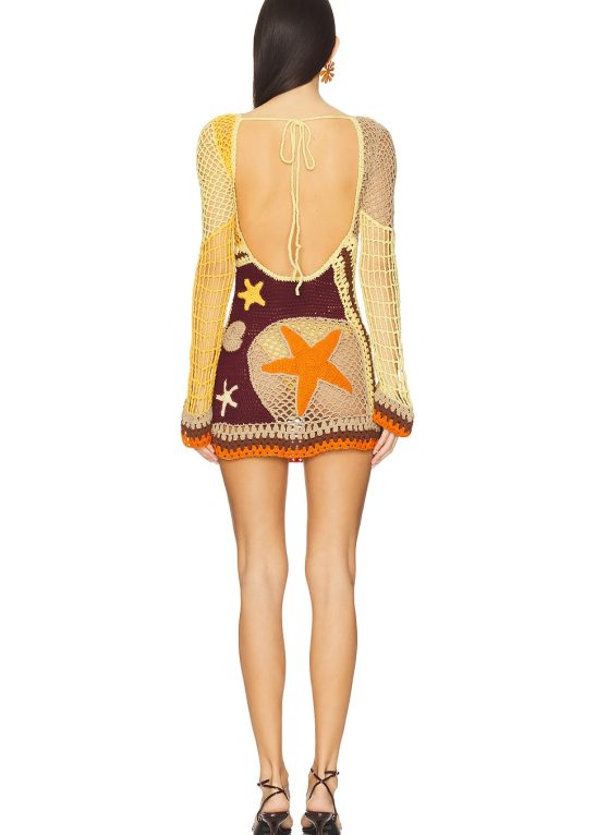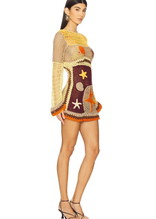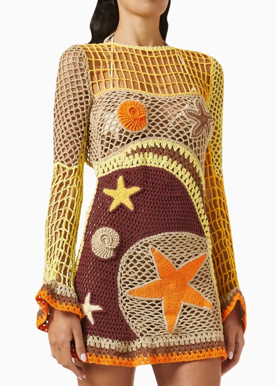 The beach dress exudes a carefree, bohemian vibe. Perfect for sunny days and warm evenings, it’s cut from luxuriously lightweight crochet fabric that hugs the body softly, perfect for warmer climates.
